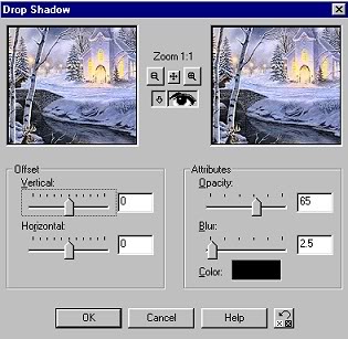 Effects, cutout vertical and horizontal=0, opacity 65, blur 27.5.