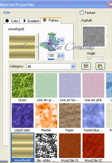 12. Go to your materials pallet on the right hand side and double click on the "Foreground" then choose pattern and look for the gold filled one.