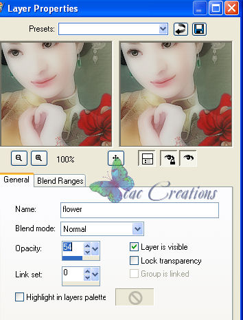 25. Now go to the layers pallet and double click on the flower layer and lower the Opacity to 54. Click okay when your done. You just made the flower a little more transparent.