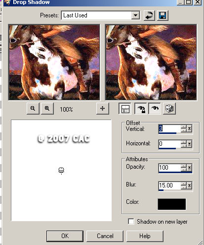 Next go back to Effects/3d effects/drop Shadow on the same settings that I have: