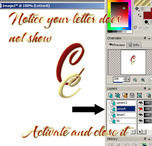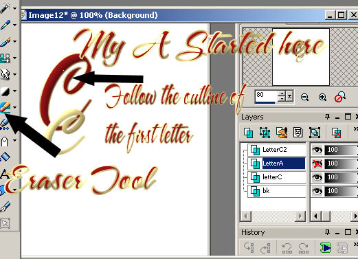 8. After you have completed the second letter move to the third letter doing the same thing. (Click on it to activate it then close it so you only see the first letter). Then with your eraser start to outline the letter.